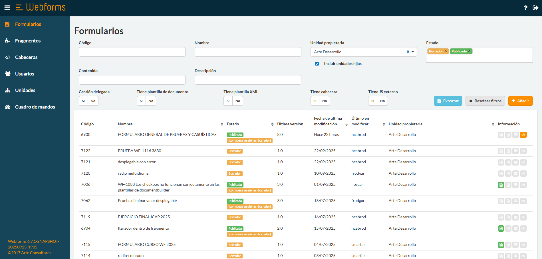 - Estado: el estado del formulario. Por defecto solo aparecen los formularios publicados o en borrador, no los archivados. Puedes ver más sobre los diferentes estados en Control de versiones.